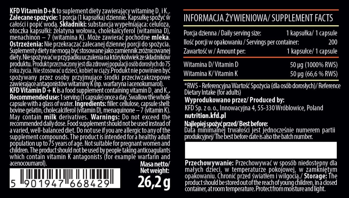 KFD Vitamin D3 + K2 to suplement diety w postaci kapsułek, który łączy witaminę D3 w dawce 50 µg oraz witaminę K2 w formie MK‑7 (menachinon‑7) – 50 µg. Formuła została opracowana z myślą o codziennej suplementacji, szczególnie w okresach, gdy ekspozycja na słońce jest ograniczona.